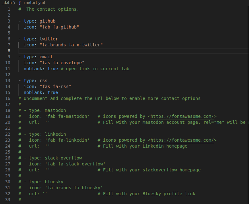 Chirpy의 좌측 하단 링크들은 Repo의 /_data/contact.yml에서 관리된다.