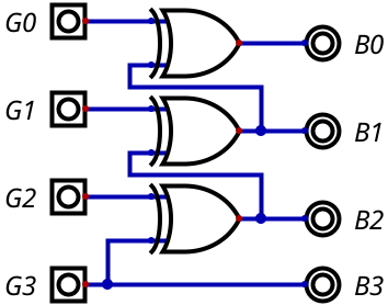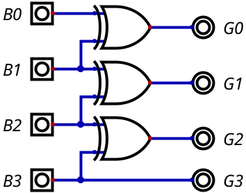 10진수 $B_{3}$ $B_{2}$ $B_{1}$ $B_{0}$ $G_{3}$ $G_{2}$ $G_{1}$ $G_{0}$ 0 0 0 0 0 0 0 0 0 1 0 0 0 1 0 0 0 1 2 0 0 1 0 0 0 1 1 3 0 0 1 1 0 0 1 0 4 0 1 0 0 0 1 1 0 5 0 1 0 1 0 1 1 1 6 0 1 1 0 0 1 0 1 7 0 1 1 1 0 1 0 0 8 1 0 0 0 1 1 0 0 9 1 0 0 1 1 1 0 1 10 1 0 1 0 1 1 1 1 11 1 0 1 1 1 1 1 0 12 1 1 0 0 1 0 1 0 13 1 1 0 1 1 0 1 1 14 1 1 1 0 1 0 0 1 15 1 1 1 1 1 0 0 0